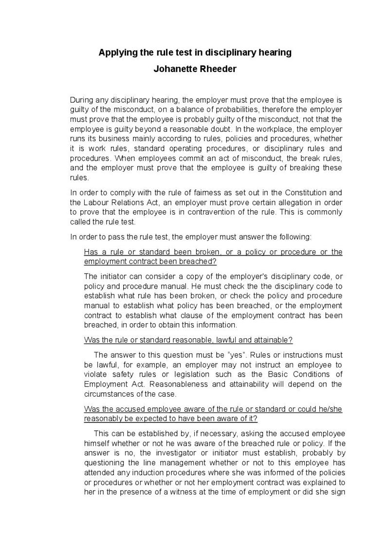 This document gives detailed instructions on how to apply the rule test for disciplinary hearings, During any disciplinary hearing, the employer must prove that the employee is guilty of the misconduct, on a balance of probabilities, therefore the employer must prove that the employee is probably guilty of the misconduct, not that the employee is guilty beyond a reasonable doubt. In the workplace, the employer runs its business mainly according to rules, policies and procedures,
